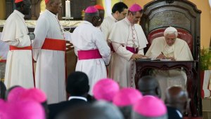 Samedi 19 novembre 2011, en la basilique de l’Immaculée Conception de Ouidah (Bénin), le pape Benoît XVI a signé l’exhortation apostolique « Africae Munus ». « Afrique, Bonne Nouvelle pour l’Eglise, deviens-le pour le monde entier! » a lancé le pape.
